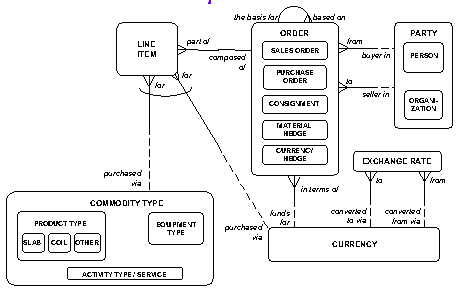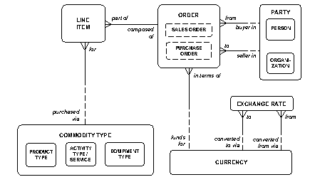 For example, Figure 1 shows a model of an order. Any sales or purchase order for any company must look like this. Note that instead of entities for "customer" or "vendor", you have here party. A party is simply any person or organization that is of interest to the enterprise. Here each is playing the role of customer or vendor. Specifically, "each party may be a buyer in one or more orders," and "each party may be a seller in one or more orders." If the seller is one of our own departments, the order is (to us) a sales order. If the buyer is one of our own departments, it is (also to us) a purchase order.